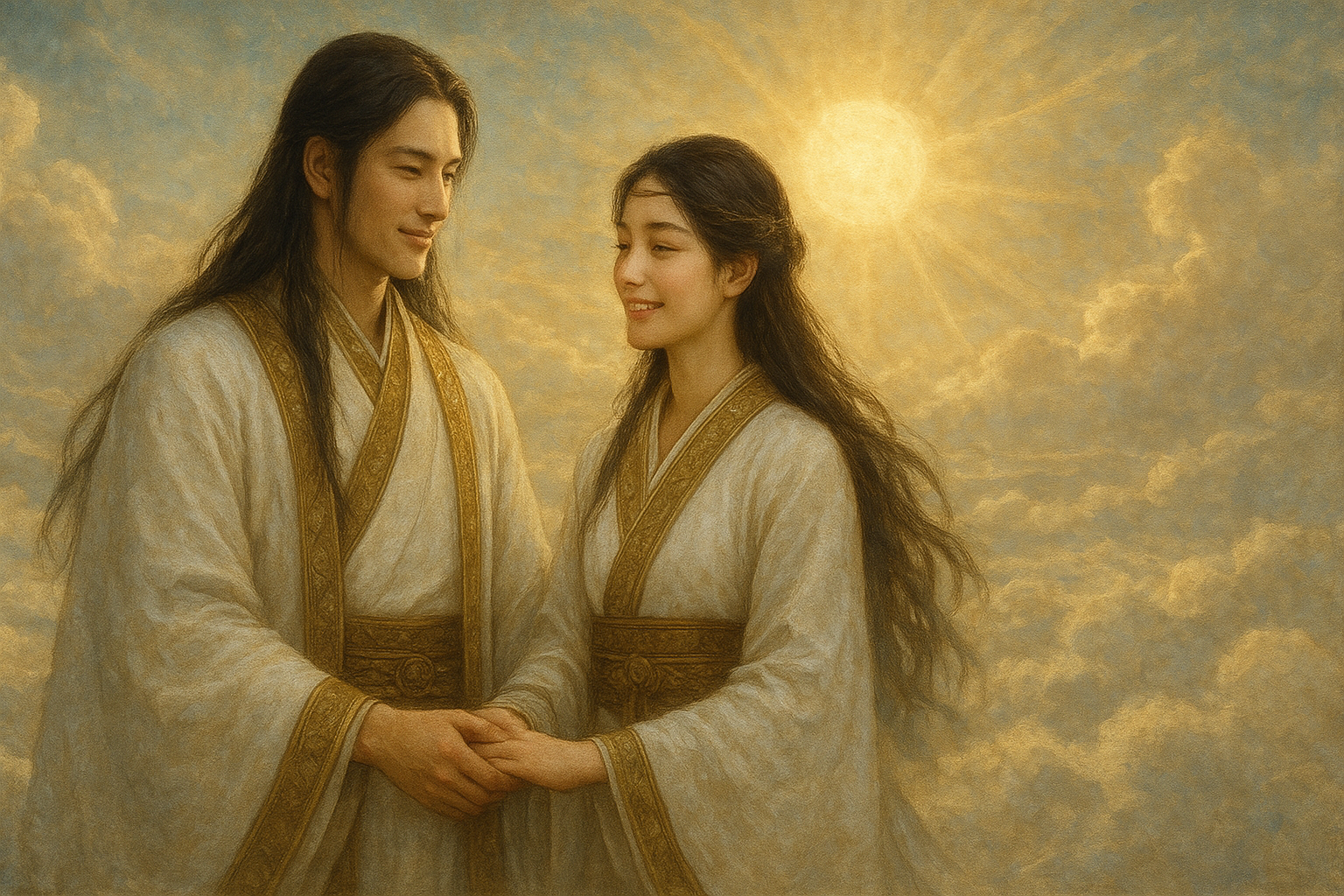 伊邪那岐尊、伊邪那美命の二神は、大地を完成させるように命じられます。天沼矛(あめのぬぼこ)を用いて二柱は天浮橋(あめのうきはし)にお立ちになり、渾沌とした地上を掻き混ぜます。