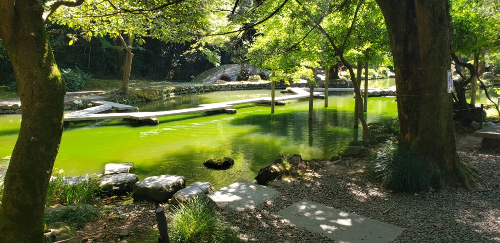 尾山神社の神苑です。尾山神社の境内は広い敷地となっていて本殿に向かって右側に位置するこちらの神苑では涼を取る事ができます。