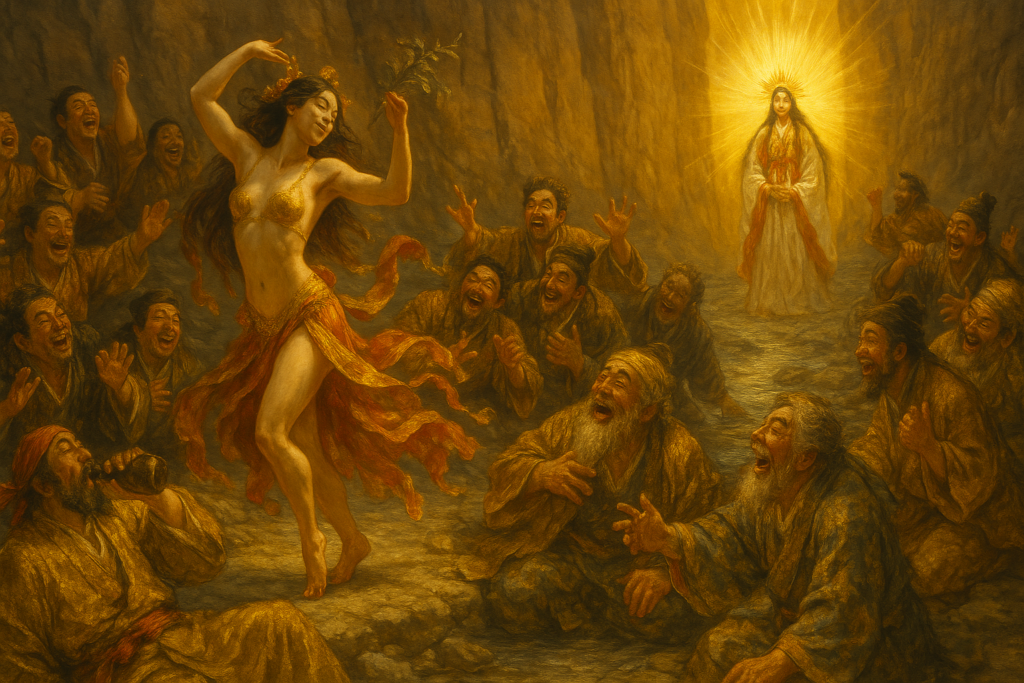 すると太陽の神であるアマテラスがお隠れになられたたことで、世界は暗闇に包まれてしまいます。困り果てた神々は大勢の神様をお集めになられて祭りを執り行いました。そうすることでアマテラスのお気持ちをこちらに傾けさせ、天岩戸を開けた瞬間に引っ張り出す、という作戦を思いつきました。