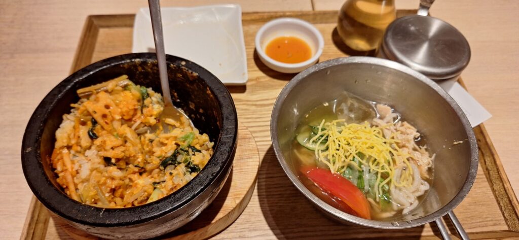 石焼ビビンバと冷麺のセットをいただきます。カリカリとした香ばしいおこげにかじりつきながら、鳥出汁の利いた冷麺のスープでのどを潤します。ツルツルしこしこした冷麺の歯応えを噛みしめ、のど越しを楽しむと辛味で火照った身体も徐々にクールダウン。大変おいしくいただきました。