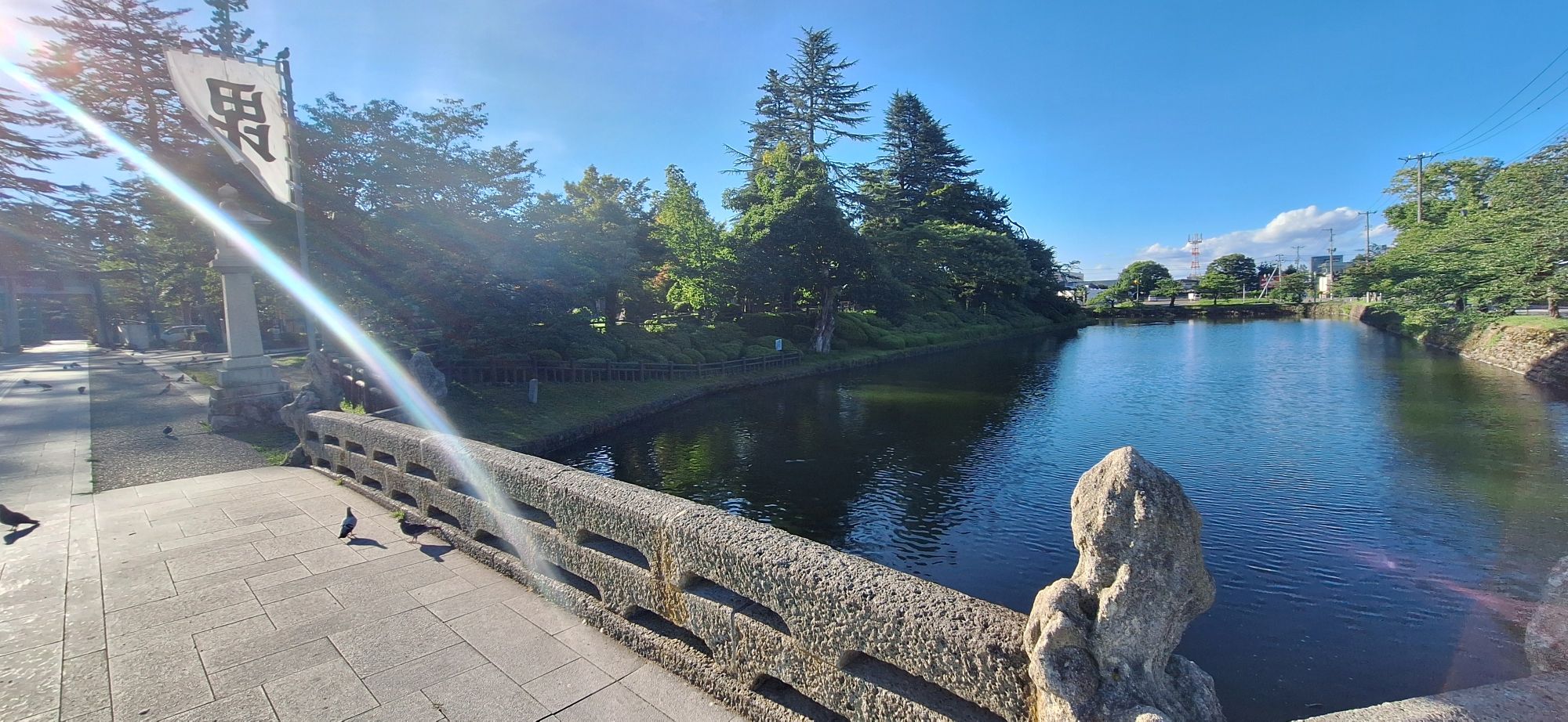 ようやく米沢城址へと到着したしました。こちらにも「毘」の文字がはためいております。お堀を横目にこの先にご鎮座している上杉神社へと参りましょう。