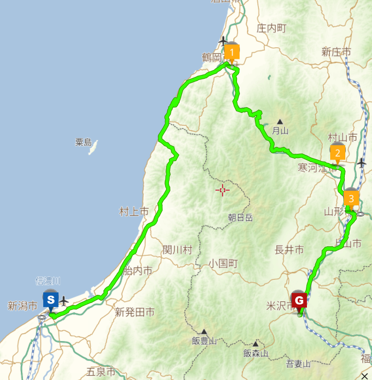 新潟駅を出発して山形県第二の都市である鶴岡市を通ります。寒河江市に寄り道をして山形市を南下して米沢城址を目指します。