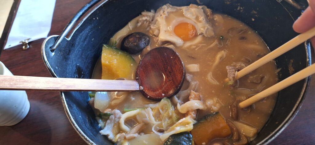 大きな鉄鍋いっぱいに食材を使用した贅沢な一品。野菜のうまみや鶏出汁のうまみが溶け込んだ汁をすすると、口の中いっぱいに幸せが広がります。半熟の卵をどのタイミングで割ろうかと考えながら食べ進めます。ほうとう独特の麺の歯応えを感じ、食材の旨味の溶けだしたスープを飲みほして完食いたしました。