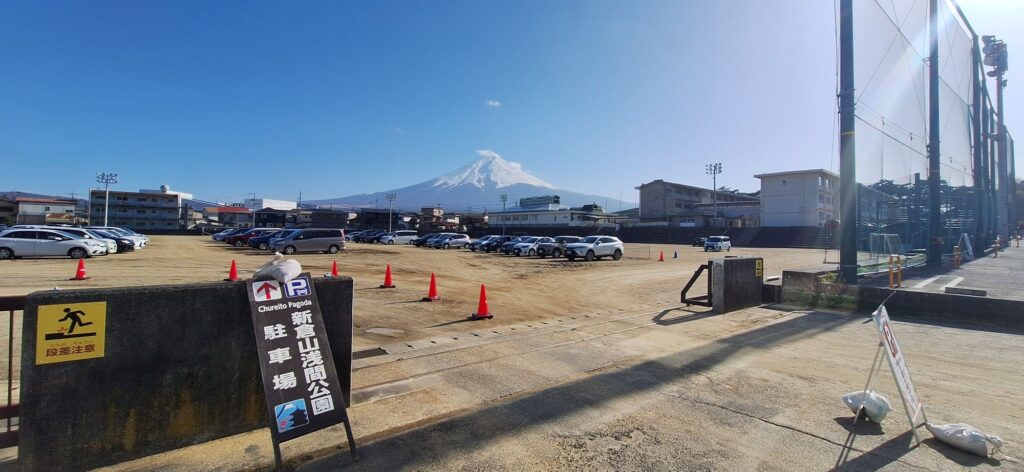 新倉富士浅間公園の桜祭りの開催中には、小学校のグラウンドを臨時駐車場として利用している様子です。辺り一帯の駐車場は個人宅で運営している駐車場であっても一律1,000円で利用することができました。