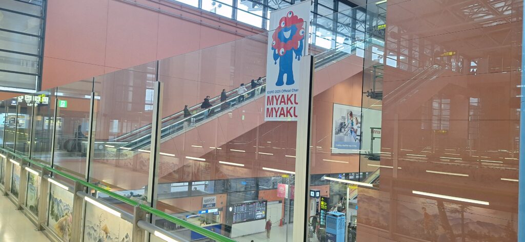 関西国際空港に到着いたしました。大阪万博のミャクミャクにお出迎えをしていただきました。広い…