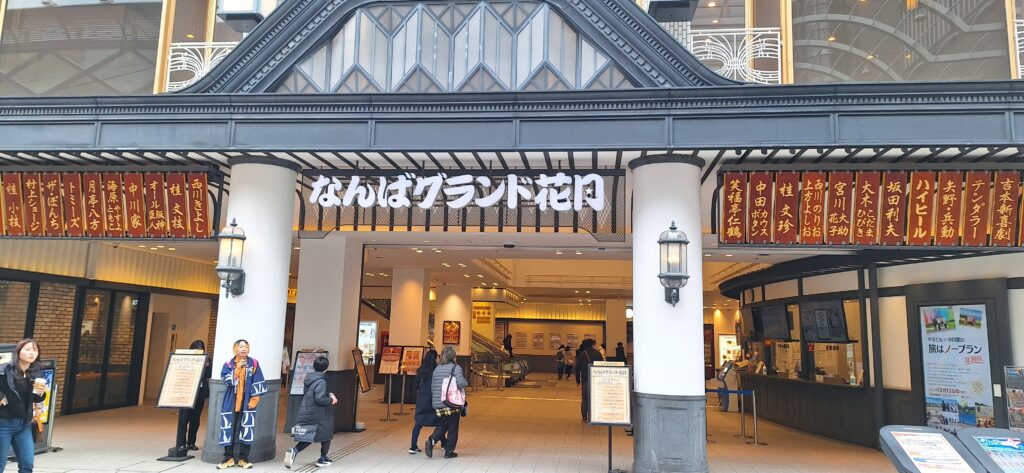 関西国際空港から電車で乗り換えなしでなんば駅まで移動いたします。お笑いの聖地「なんばグランド花月」へと到着いたしました。こちらに来た際は銀シャリがご出演される予定でした。