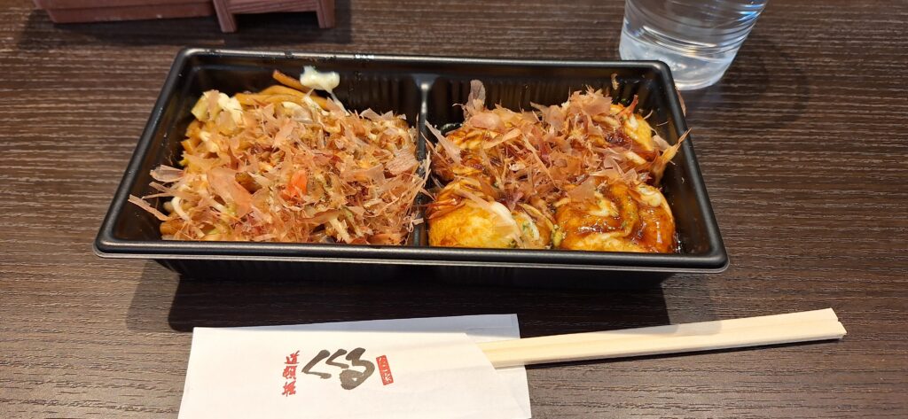 どちらも「粉もん」として大阪の地元の皆様に親しまれている「焼きそば」と「たこ焼き」を両方楽しめる一品です。到着するとすぐにソースと鰹節の濃厚な香りが鼻先をくすぐります。
