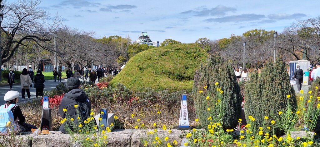 道頓堀から徒歩と電車で森ノ宮駅まで移動して大阪城公園まで参りました。改札を出ると遠方に大阪城の天守閣らしき姿が望めます。