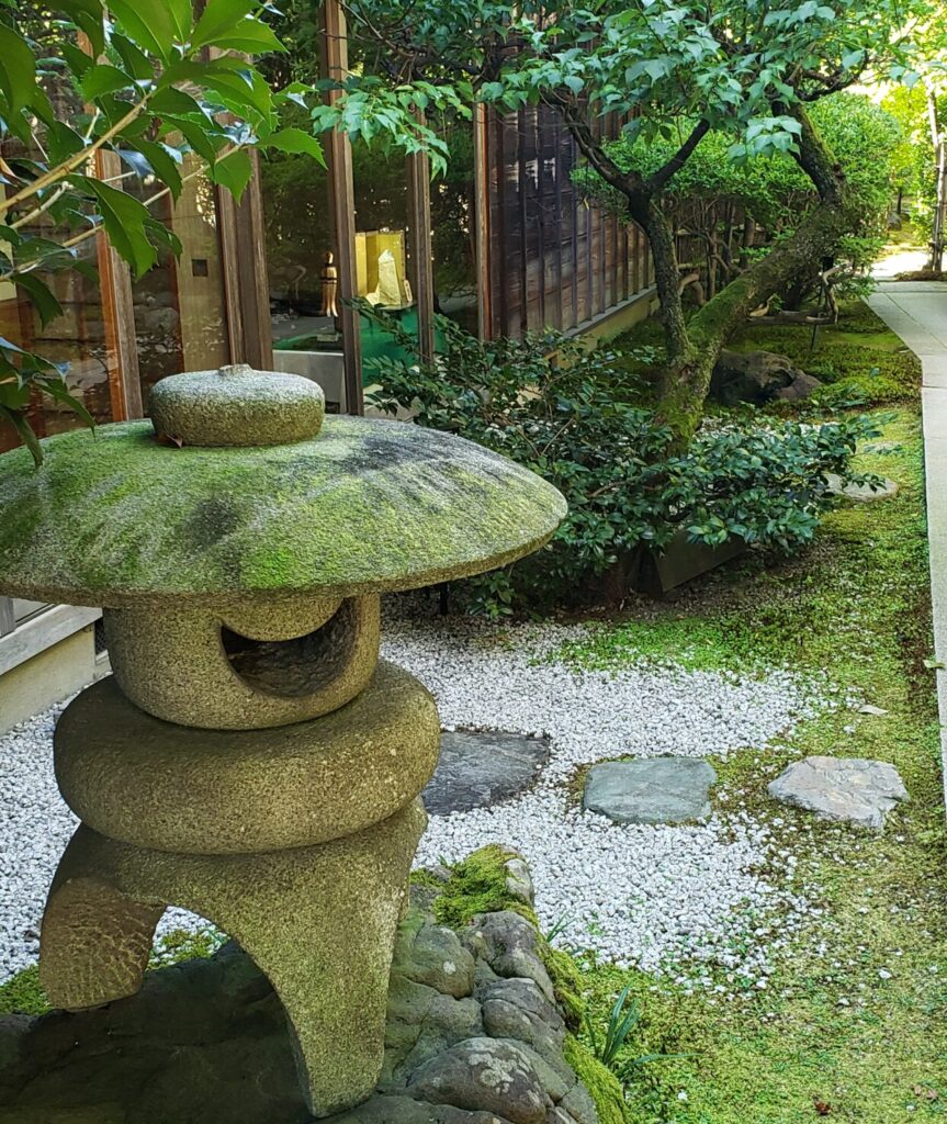 武家長屋の一角に佇む庭園を見学させていただきます。苔のむした石灯籠に風情を感じます
