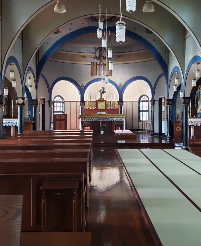入館する際にシスターにもご挨拶をさせていただきました。武家長屋近くに存在する教会であるだけに、礼拝者が座る場所が畳敷きとなっていますね