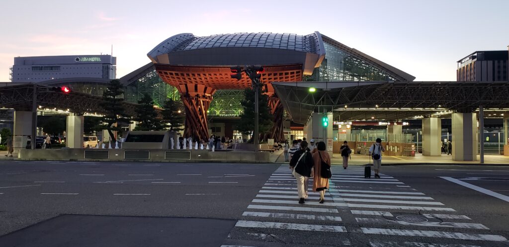 金劔宮に訪れる前日に一泊し、金沢駅の象徴である鼓門を拝見。明日の早朝に出発して長町武家屋敷跡(ながまちぶけやしきあと)を目指します。