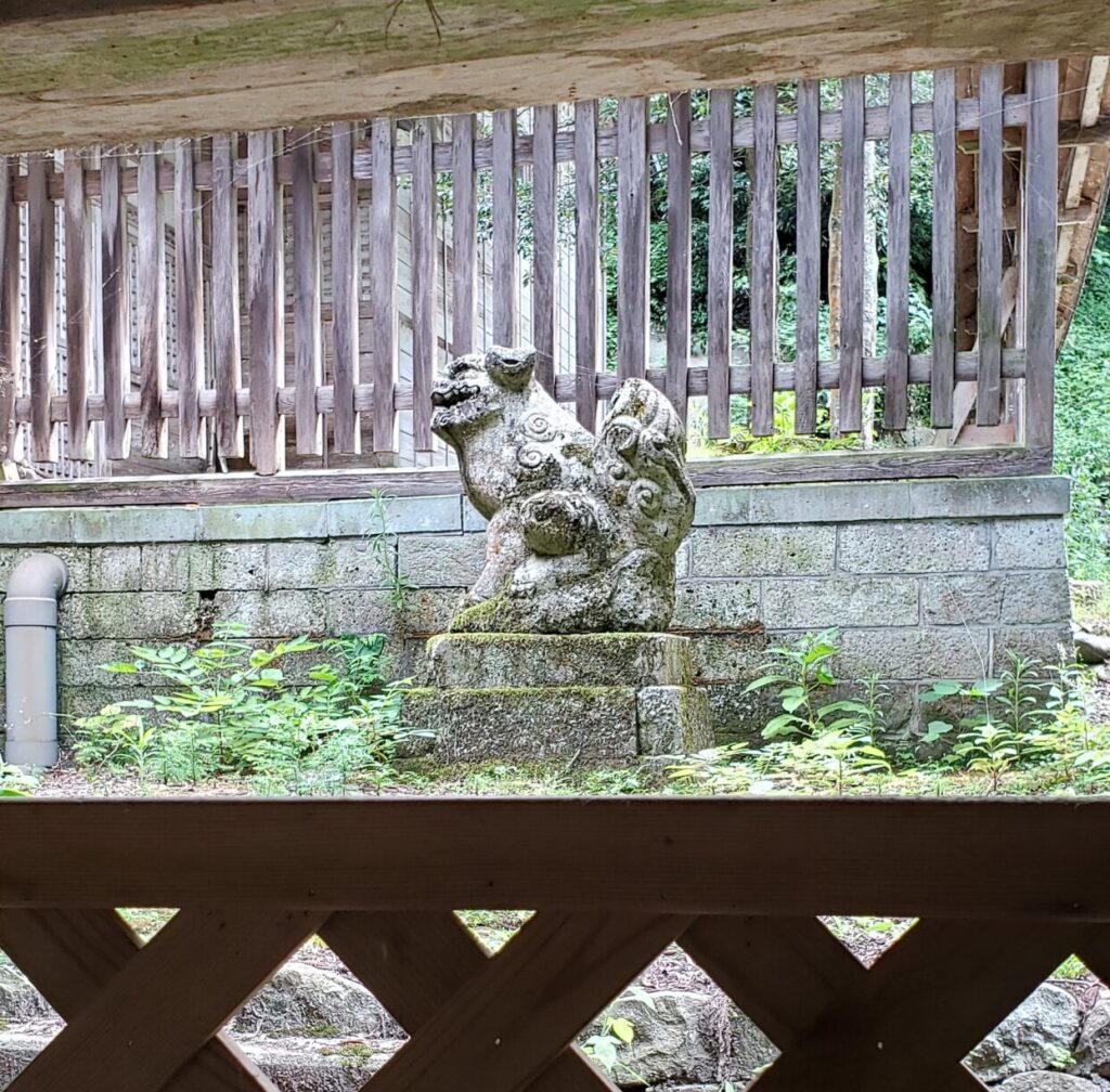反対側の狛犬さんは境内の軒下に入らなければ拝見することが出来ず、神職さんにお伺い立てて撮影させていただいた貴重なお姿です。