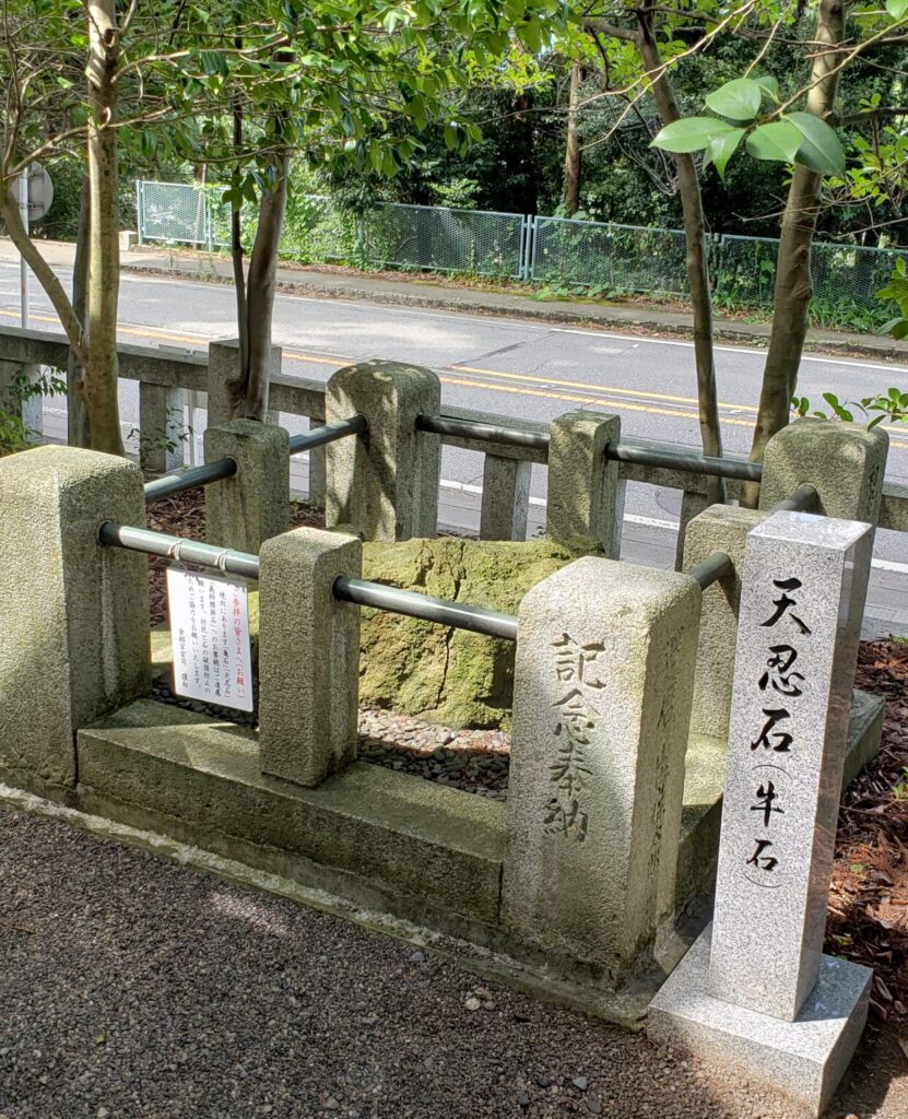 天忍石(牛石)神仏が一時的に姿を現すといいう意味の「影向石」ともいわれ、神様がこの石に降臨されたといわれています。牛の姿に似ていることから牛石とも呼ばれています。